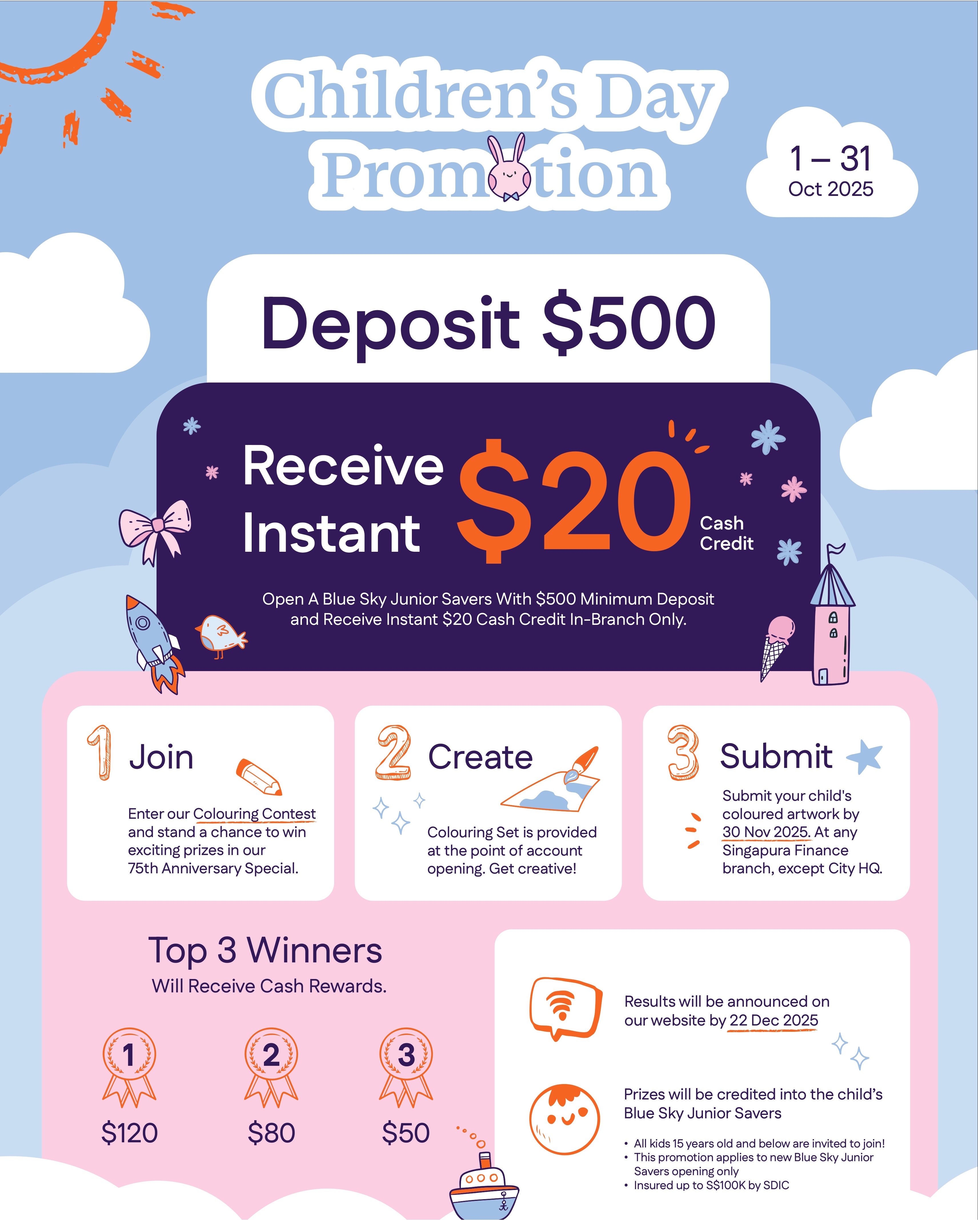 Top 3 winners will receive Cash Rewards, and will be credited into the child’s Blue Sky Junior Savers Account.